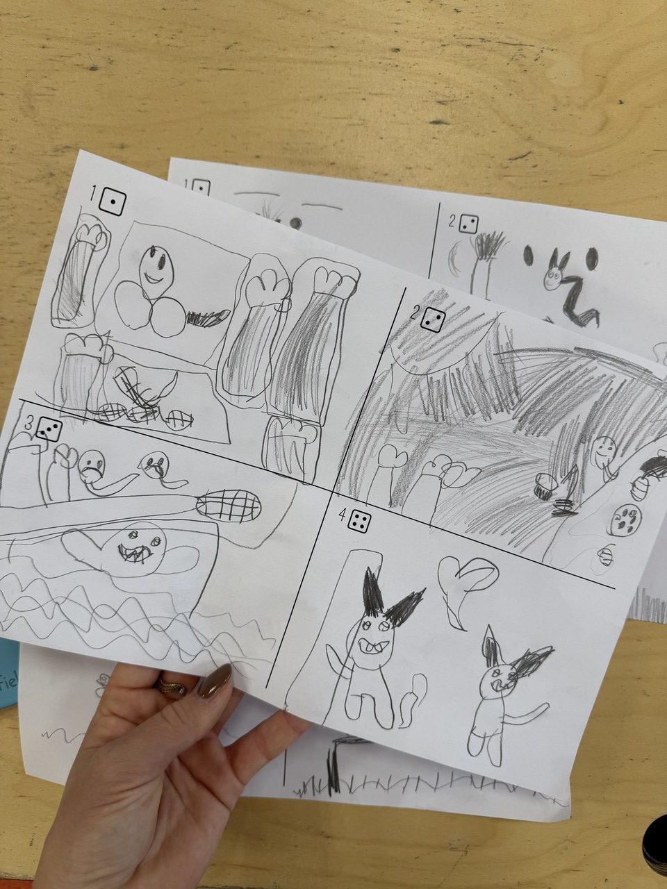 Dit is een activiteit die je gemakkelijk kunt inzetten en waarin kinderen zelfstandig bezig zijn: Je verdeelt een blad in vier vakken en stopt tijdens het voorlezen vier keer. Na elk fragment tekenen de kinderen wat ze net gehoord hebben in één vak. Leg de nadruk op functioneel tekenen, het gaat er niet om dat kinderen de meest gedetailleerde of ‘mooie’ tekeningen maken, maar dat ze aan de hand van hun tekening kunnen vertellen wat er in het verhaal gebeurt. Doordat alle kinderen zelfstandig verwerken kun je tijdens je observatie heel goed zien hoe de luistervaardigheid zich per kind ontwikkeld.