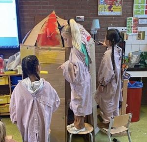 Arina wilde de zelfstandigheid van de kinderen vergroten en kwam op het idee voor een bijzondere plek om boeken te lezen. Tijdens het project Rikki en de maan maakten de kinderen met elkaar een leesraket. Arina vroeg de kinderen om karton mee te nemen en maakte toen zelf de raket. Daarna waren de kinderen aan de beurt om de raket te verven en mee te denken over een geschikte naam. De kinderen kozen voor Mar.Ar.2.3: een afkorting van de namen van de juffen en van groep 2/3. De inrichting van de raket en het uitzoeken van de passende boeken was een taak voor de kinderen. De kinderen vonden het heerlijk om in de leesraket een boek te lezen. Arina zorgt nog steeds bij elk nieuw thema dat er zoveel mogelijk boeken aanwezig zijn in de leeshoek die aansluiten bij het onderwerp. De kinderen zijn hierdoor betrokken en raken enthousiast. Bij haar komt het regelmatig voor dat de kinderen vragen: ‘Ben je al naar de bibliotheek geweest voor nieuwe boeken juf?’ Ook nemen kinderen boeken mee van thuis wanneer deze aansluiten bij een thema.