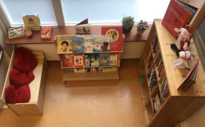 Nienke is op zoek gegaan naar een mooie, grote kast. Deze heeft ze vastgezet tegen de muur, geverfd en gezellig gemaakt met leuke kussens, bijpassende knuffels en lampjes. Uiteraard is de hoek ook voorzien van mooie boeken passend bij het thema. De Gruffalo bij het thema herfst, Beloofd is beloofd kleine panda’s bij het thema ‘op avontuur’ en de boeken van Boer Boris komen bij diverse thema’s terug. Het zijn boeken die kinderen aanspreken en waar zij zelf de verhalen bij kunnen vertellen. Vanaf het begin waren de kinderen enthousiast en betrokken: ‘O juf, wat mooi!’ klonk het, en: ‘Wanneer mag ik in de kast?’ Plots ontstond er een rij voor de leeshoek.
