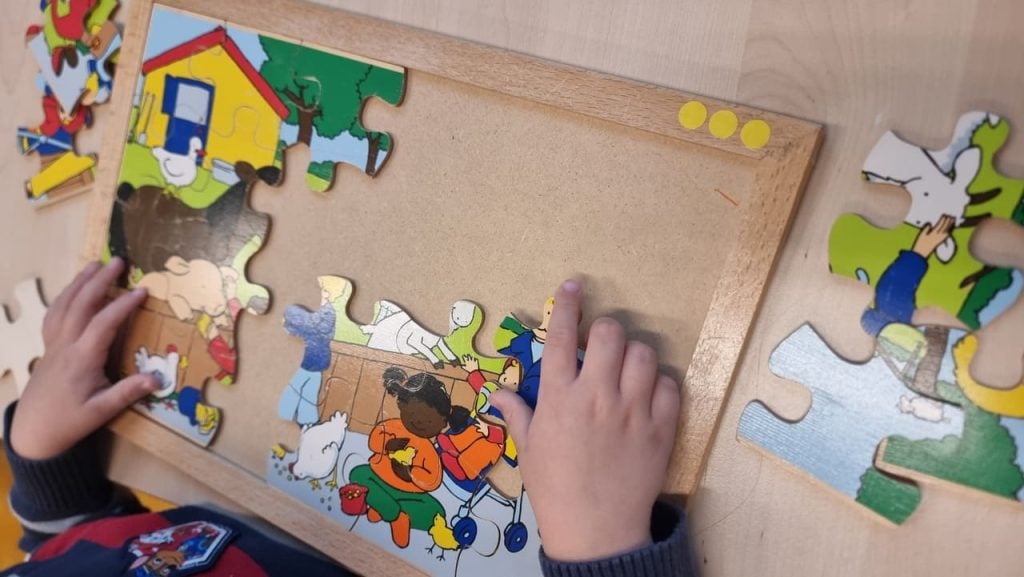- Metacognitie: Het vermogen om over je eigen denken na te denken en je aanpak aan te passen (zelfreflectie). In elke klas wordt gepuzzeld. De kinderen passen, draaien of proberen het stukje ergens anders. Ze denken bewust na over hun eigen handelen. Als leerkracht kun je ook aandacht besteden aan de metacognitie door na afloop van een activiteit te reflecteren met de kinderen. In de klassen van Manon en Renate kijken de kinderen na het speel- en werkmoment terug op wat ze hebben gedaan, hoe ze het hebben gedaan, of ze het anders hadden kunnen doen, wat ze geleerd hebben en of hun plan gelukt is. In tweetallen overleggen de kinderen hierover met elkaar. Wil je meer ideeën over hoe je dit kunt aanpakken? Lees dan deze blog: Reflecteren met kleuters.