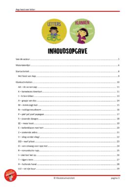 Voor je liggen de klankactiviteiten die geschreven zijn bij het boek Aap leest een letter. Tijdens de activiteiten komen de kinderen speelsgewijs in aanraking met alle klanken en letters van ons alfabet. In de activiteiten staan doelen centraal die vooral gericht zijn op de eerste fasen van de ontwikkeling van het fonemisch bewustzijn en het alfabetisch principe. De kinderen leren om klanken op een juiste manier uit te spreken en deze auditief te herkennen. Dit is een belangrijke voorwaarde voor de latere klanktekenkoppeling. Naast deze doelen lopen leesplezier en leesmotivatie als een rode draad door alle activiteiten.