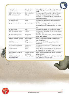Alle klankactiviteiten zijn telkens opgebouwd uit drie onderdelen: het introduceren van de nieuwe klank met aandacht voor de uitspraak, het voorlezen van de bijbehorende bladzijde waarbij klankherkenning een belangrijke rol heeft en tot slot een verwerkingsopdracht waarbij de kinderen actief bezig zijn en speelsgewijs de klank consolideren. Het is mogelijk om de verwerkingsopdracht op een later moment uit te voeren. In totaal zijn er bijna veertig klankactiviteiten, inclusief start- en afsluitende activiteit. Je kunt de klanken naar eigen inzicht aanbieden. Dat houdt in dat je alle klanken óf een selectie daarvan aan bod laat komen. Nadat je de startactiviteit en de klankactiviteit /aa/ hebt aangeboden, ben je vrij om de volgorde van de aan te bieden klanken te bepalen. Achterin vind je de consolideeractiviteiten. Deze activiteiten kosten weinig voorbereiding en kun je gemakkelijk tussendoor doen. De consolideeractiviteiten zijn geschikt om eerder aangeboden klanken te herhalen.