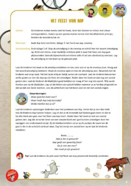 Aap geeft een feest, maar zijn gasten kunnen de uitnodiging niet lezen! Help Aap en nodig na elke klankactiviteit een nieuwe gast uit. Ontdek zo op speelse wijze alle letters en klanken van onze taal. Met deze activiteiten werk je het hele jaar door aan de ontwikkeling van het fonemisch bewustzijn. De bijna 40 klankactiviteiten zijn geschreven bij het boek ‘Aap leest een letter‘ van Isabelle Gielen & Jan Van Lierde.