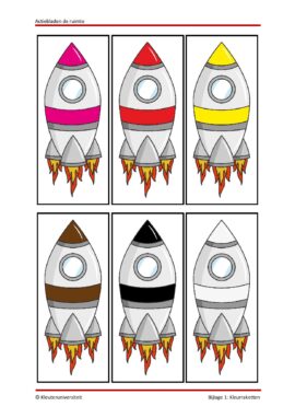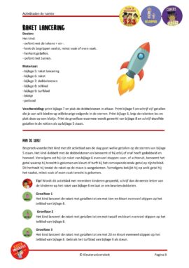Er zit ook een toffe kleur op nummer opdracht bij waarbij de kinderen hun eigen kleur op nummer samen moeten stellen. Dit doen ze door met een pittenzak naar cijfers op raketten te gooien en een pittenzak naar een gekleurde raket. Dit vullen ze in op hun blad, vervolgens schrijven ze cijfers in hun kleurplaat en kleuren maar! Leuk om te zien dat sommige kinderen hier een ‘fantasie’ kleurplaat maken, waar andere bewust cijfers neerzetten, omdat ze bijvoorbeeld willen dat de lucht ook echt blauw wordt.