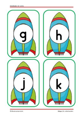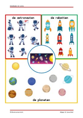Superleuk actiebladenpakket weer! Goed in te zetten bij je thema. Ik heb lang niet alles gedaan hiervan, omdat ik ook het spellenpakket ruimte had (ook een aanrader!). Wat bij in de klas wel echt een groot succes was, was de opdracht waarbij er verspreid door de ruimte (bij ons het schoolplein) kaartjes hingen van astronauten, van raketten en planeten en waarbij de kinderen op hun blaadje steeds af moesten kruisen welke ze zagen hangen. Uiteindelijk bleef er steeds één astronaut, één raket en één planeet over dus wisten de kinderen welke astronaut met welke raket naar welke planeet is gevlogen. Dit kan je vaker herhalen, want je kunt weer een andere astronaut, raket en planeet achterhouden. Dit hebben we dan ook vaker gedaan. Hierin zit overigens ook differentiatie, dus ook op die manier kun je weer variëren.