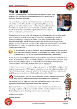 ‘Alfabet‘ is het geweldige boek van Charlotte Dematons waaraan ze drie jaar heeft gewerkt. Bij elke plaat zie je woorden en werkwoorden die te maken hebben een letter. In dit project voor gebruik bij het boek vind je bij elke letter van het alfabet een activiteit gericht op het fonologisch of fonemisch bewustzijn, met activiteiten rondom rijmen, kritisch luisteren, letters, klanken, woorden en zinnen. Het project bevat meer dan dertig activiteiten en enkele spellen en de suggesties per activiteit zijn grotendeels ook in te zetten bij andere letters en klanken. De illustraties in de bijlagen van het project zijn speciaal door Charlotte Dematons voor Kleuteruniversiteit gemaakt. Je hebt het boek nodig voor uitvoering van dit project.