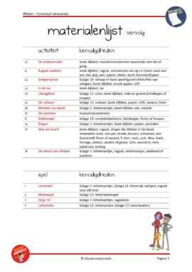 Het lesrooster vind je op pagina 4 en kun je naar eigen inzicht invullen. Je kunt er ook in bijhouden welke activiteiten je gedurende het jaar hebt uitgevoerd. Op de materialenkaart zie je welk materiaal je voor elke activiteit nodig hebt. Wanneer je een bijlage nodig hebt, wordt dat bij de activiteit onder het kopje ‘benodigdheden’ vermeld. Druk de bijlage af, knip de afbeeldingen uit en lamineer deze zo nodig.