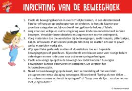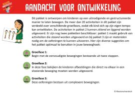 Dit beweeghoek pakket is ontworpen om kinderen op een uitnodigende en gestructureerde manier te laten bewegen. De meer dan 20 activiteiten in dit pakket zijn verdeeld over verschillende groeifases, zodat elk kind zich op zijn eigen tempo kan ontwikkelen. De activiteiten in dit pakket kunnen zittend en liggend worden uitgevoerd. Er zijn nog twee pakketten beschikbaar: pakket 1 maakt gebruik van activiteiten die staand worden uitgevoerd en bij pakket 3 zijn er materialen nodig om de oefeningen te kunnen uitvoeren.