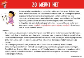 Dit beweeghoek pakket is speciaal ontworpen om je te ondersteunen bij het inrichten van een stimulerende beweeghoek, waarin kinderen op een natuurlijke en zelfstandige wijze hun grove motoriek en lichaamsbewustzijn kunnen ontwikkelen. In dit pakket zijn 60 activiteiten die gebruikmaken van verschillende materialen opgenomen, zoals: een bal, een (rol)stoel, een matje en een balk. Er zijn nog twee pakketten beschikbaar: pakket 1 maakt gebruik van activiteiten die staand worden uitgevoerd en pakket 2 maakt gebruik van activiteiten die zittend en liggend kunnen worden uitgevoerd.