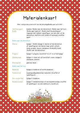Bij elk boek vind je vier activiteiten. Achter de naam van elke activiteit staat aangegeven bij welk boek deze hoort. De activiteiten volgen de verhaallijn van het boek. In totaal bevat dit pakket zestien activiteiten. Welke boeken je aanbiedt en met welk boek je start, is een eigen keuze. Het is niet noodzakelijk om alle vier de boeken te behandelen. Begin elk boek met de startactiviteit, beschreven op de eerste activiteitenkaart. Hierbij ontdekken de kinderen een voorwerp, passend bij het aan te bieden boek, in de jaszak van een regenjas. Bij elk boek zal het spannend zijn wat er uit de jaszak komt!