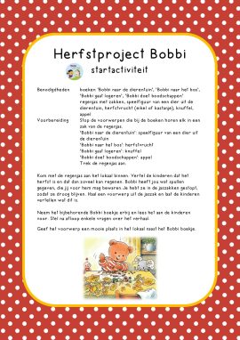Dit kleurige najaarsproject bevat kringactiviteiten bij de Bobbi boeken: ‘Bobbi naar de dierentuin’, ‘Bobbi naar het bos’, ‘Bobbi gaat logeren’ en ‘Bobbi doet boodschappen’ van Monica Maas en Ingeborg Bijlsma. Titels met een thema die zich in de herfst af kunnen spelen. Zo past ‘Bobbi naar de dierentuin’ goed bij Dierendag en is ‘Bobbi gaat logeren’ toepasselijk voor de herfstvakantie.