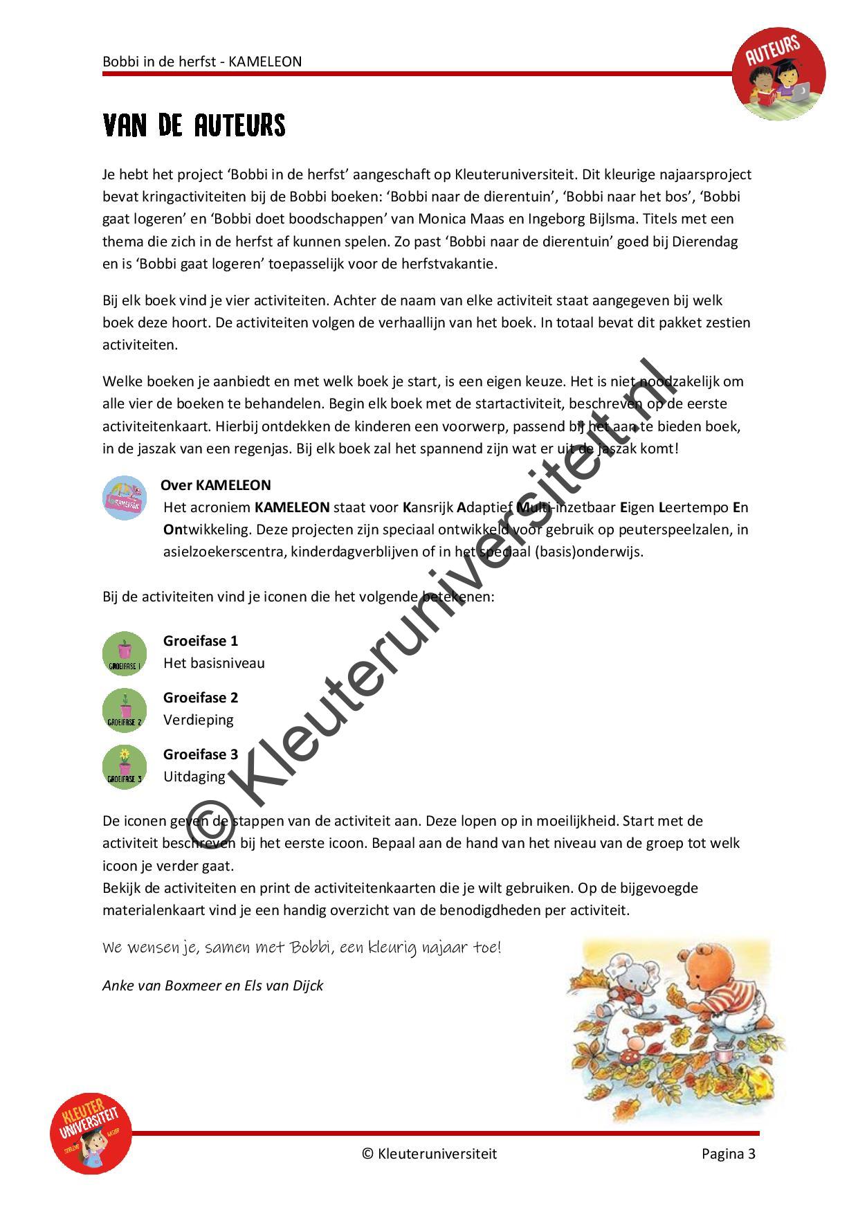 Beleef het najaar met Bobbi op de peuterspeelzaal of het kinderdagverblijf! Dit kleurige pakket bevat kringactiviteiten voor jonge kinderen bij de boeken ‘Bobbi naar de dierentuin’, ‘Bobbi naar het bos’, ‘Bobbi gaat logeren’ en ‘Bobbi doet boodschappen’ van Monica Maas en Ingeborg Bijlsma. KAMELEON projecten zijn te gebruiken op de peuterspeelzaal, in de eerste kleuterklas, het asielzoekerscentrum, het speciaal (basis)onderwijs of op het kinderdagverblijf.