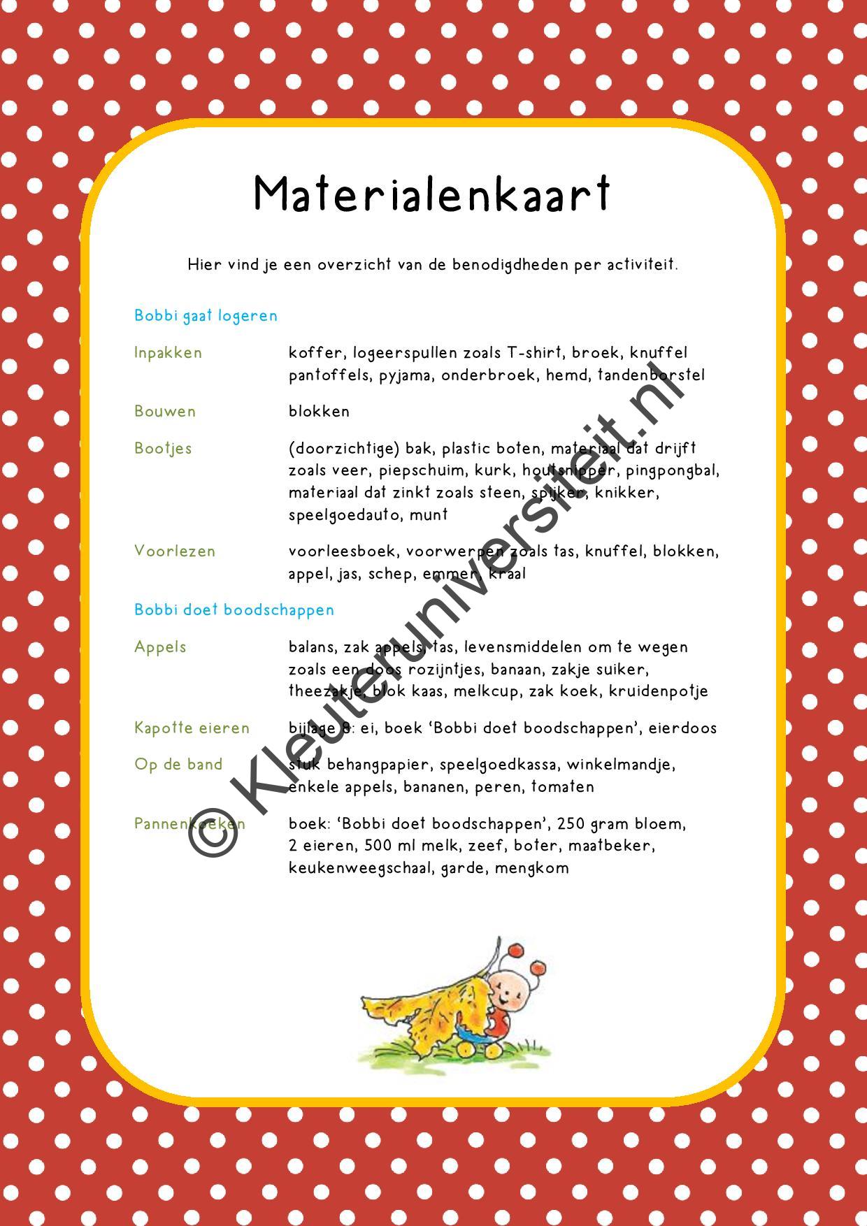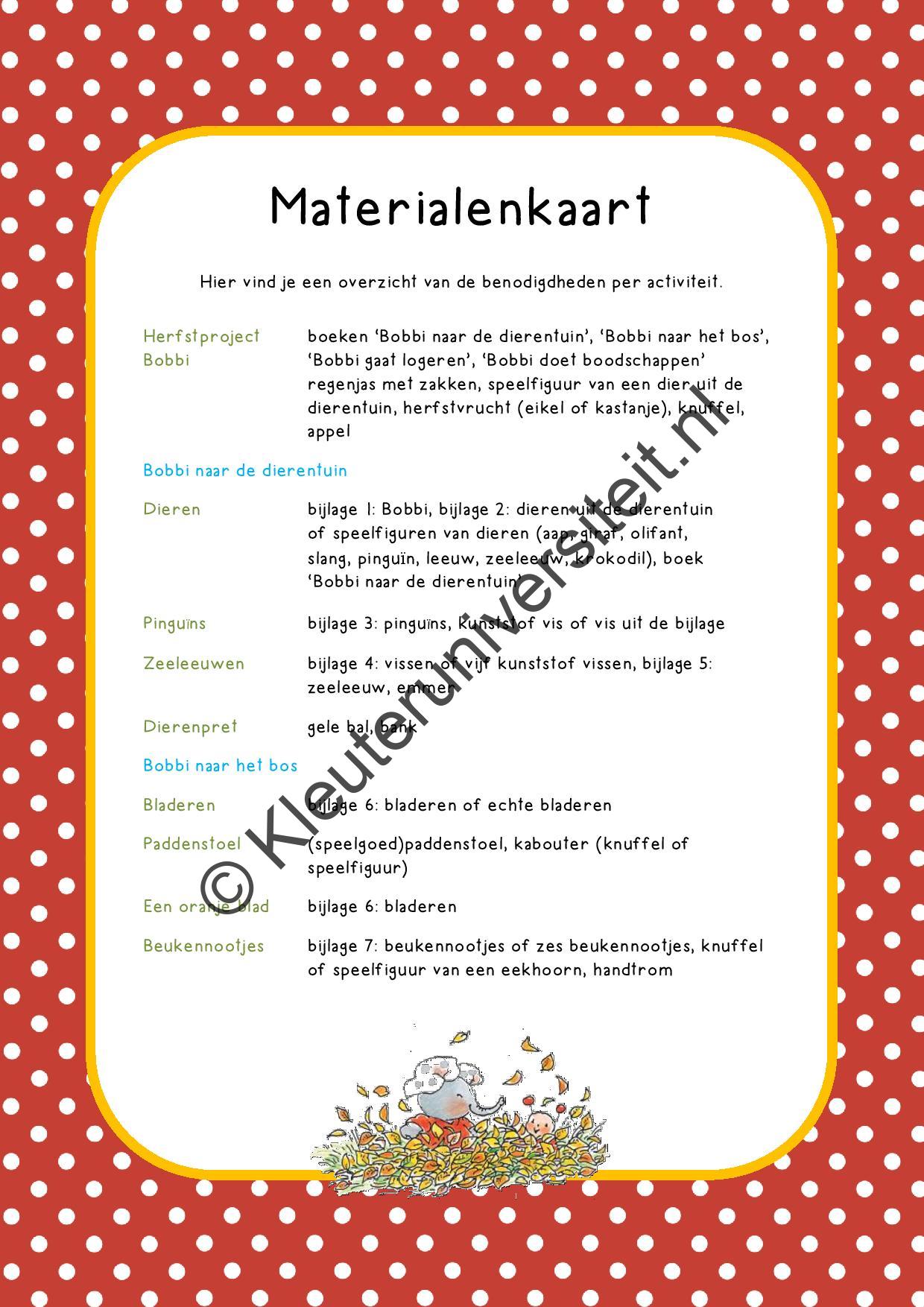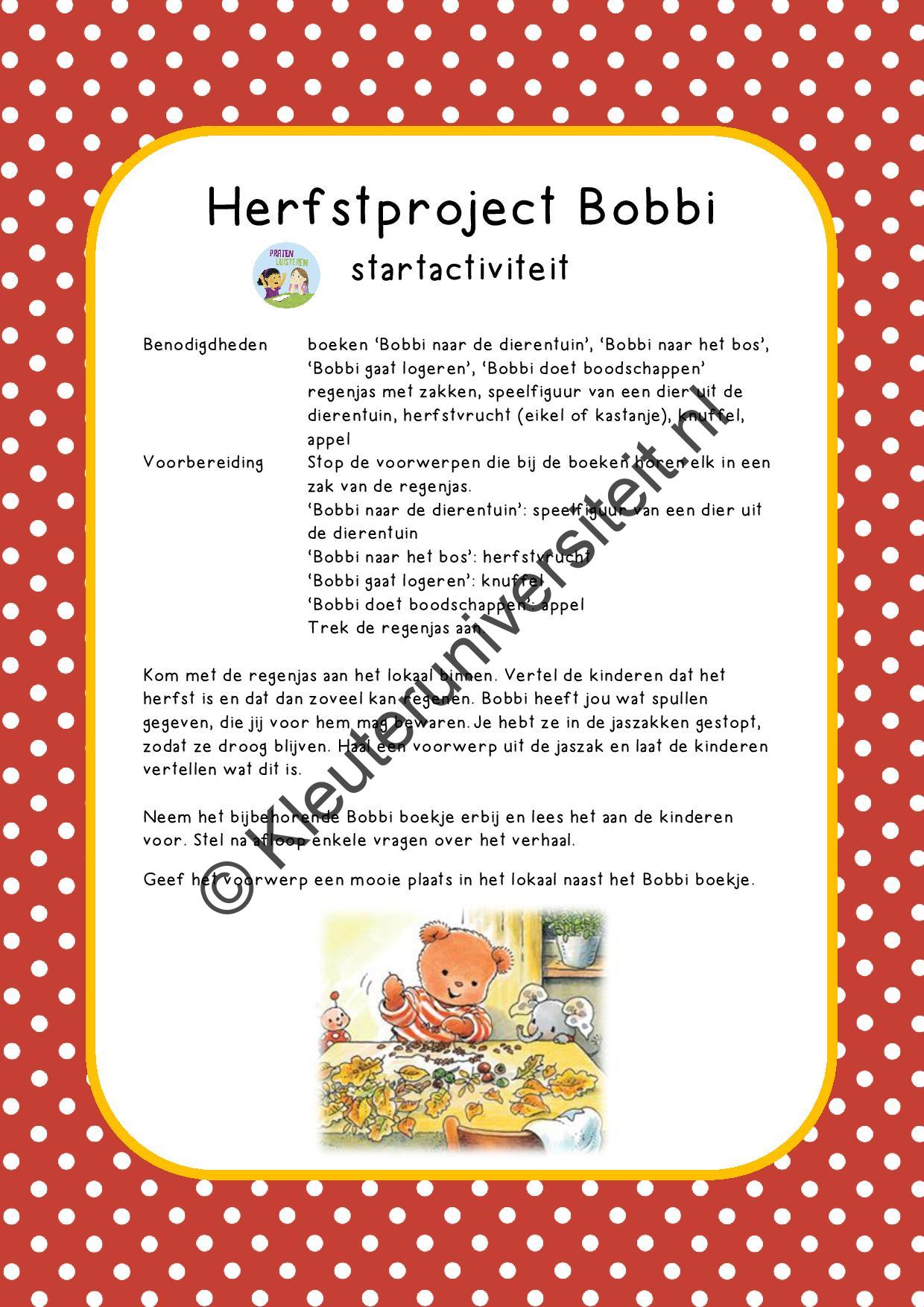Dit kleurige najaarsproject bevat kringactiviteiten bij de Bobbi boeken: ‘Bobbi naar de dierentuin’, ‘Bobbi naar het bos’, ‘Bobbi gaat logeren’ en ‘Bobbi doet boodschappen’ van Monica Maas en Ingeborg Bijlsma. Titels met een thema die zich in de herfst af kunnen spelen. Zo past ‘Bobbi naar de dierentuin’ goed bij Dierendag en is ‘Bobbi gaat logeren’ toepasselijk voor de herfstvakantie.