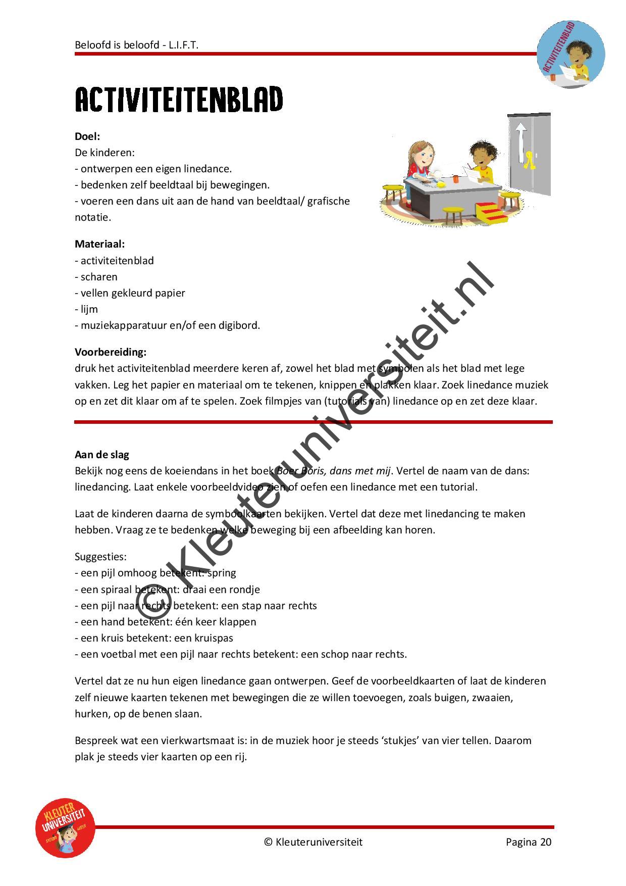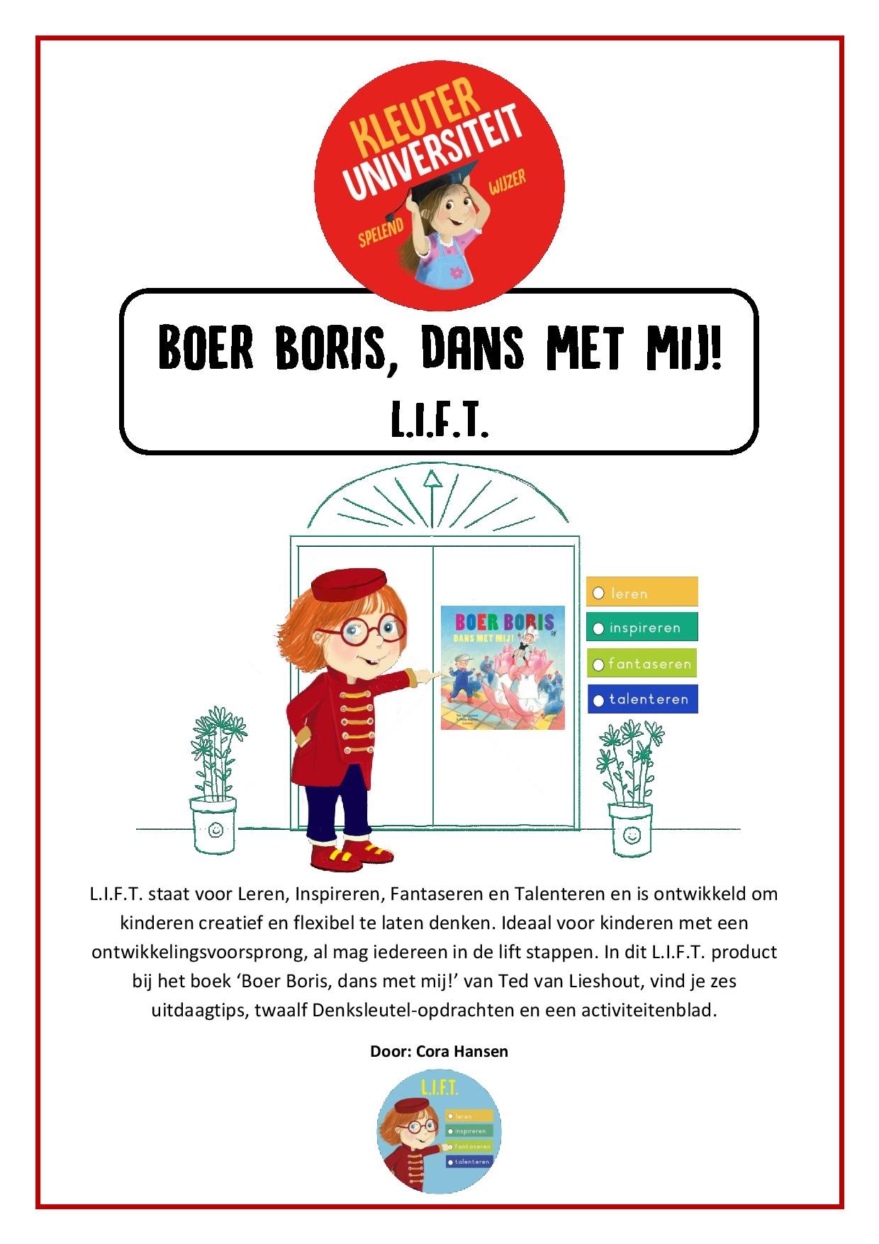 L.I.F.T. staat voor Leren, Inspireren, Fantaseren en Talenteren en is ontwikkeld om kinderen creatief en flexibel te laten denken. Ideaal voor kinderen met een ontwikkelingsvoorsprong, al mag iedereen in de lift stappen. In dit L.I.F.T. product bij het boek ‘Boer Boris, dans met mij!’ van Ted van Lieshout, vind je zes uitdaagtips, twaalf Denksleutel-opdrachten en een activiteitenblad.