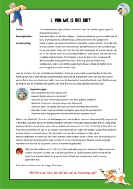 De kinderen vinden een groot bot. Het is zo groot, het zou zomaar van een triceratops kunnen zijn! Of toch niet? Tijd om te zien hoe het geraamte van deze dino eruit ziet. In het boek zien de kinderen hoe Boer Boris het geraamte van een triceratops met zijn takelwagen vervoert. Zou hij onderweg een bot verloren zijn? Mist het geraamte bij Naturalis soms een bot? Je kunt hen natuurlijk bellen. Maar om niet voor schut te staan wil je eerst uitzoeken of het echt gaat om een dinosaurusbot of toch een ander dier. Laat jouw kinderen het bottenmysterie ontrafelen en concluderen of Boer Boris hun hulp wel of niet nodig heeft. In dit project vind je activiteiten voor taal, rekenen, beweging, techniek en beeldende vorming bij het boek Boer Boris en de dino van Ted van Lieshout en Philip Hopman.