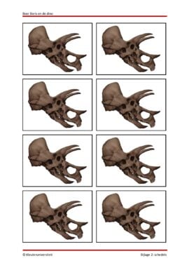 Rode draad: Elke activiteit start met een denksleutelbot. Hiermee test je of de kinderen voldoende dinokennis hebben. Sluit elke activiteit af met de vraag in het rood, kunnen ze de herkomst van het bot achterhalen? Bij de laatste activiteit ontdekken de kinderen dat het bot niet van de triceratops kan zijn.