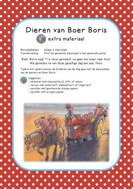 Ga je met Boer Boris mee naar zee? Dit pakket bevat bij het gelijknamige boek Boer Boris gaat naar zee van Ted van Lieshout en Philip Hopman. De activiteiten zijn kort en toegespitst op de doelen die aansluiten bij de ontwikkeling van kinderen.