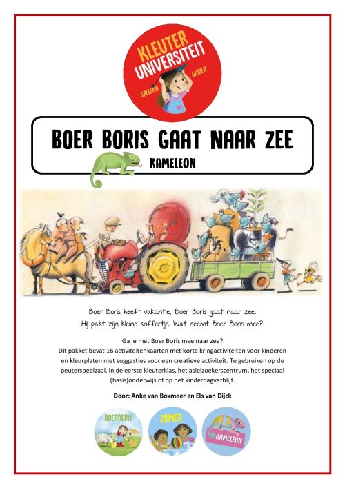 Ga je met Boer Boris mee naar zee? Dit pakket, op basis van het boek ‘Boer Boris gaat naar zee’ van uitgeverij Gottmer, geschreven door Ted van Lieshout en Philip Hopman, bevat 16 activiteitenkaarten met korte kringactiviteiten voor jonge kinderen en kleurplaten met suggesties voor een creatieve activiteit. KAMELEON projecten zijn te gebruiken op de peuterspeelzaal, in de eerste kleuterklas, het asielzoekerscentrum, het speciaal (basis)onderwijs of op het kinderdagverblijf.