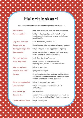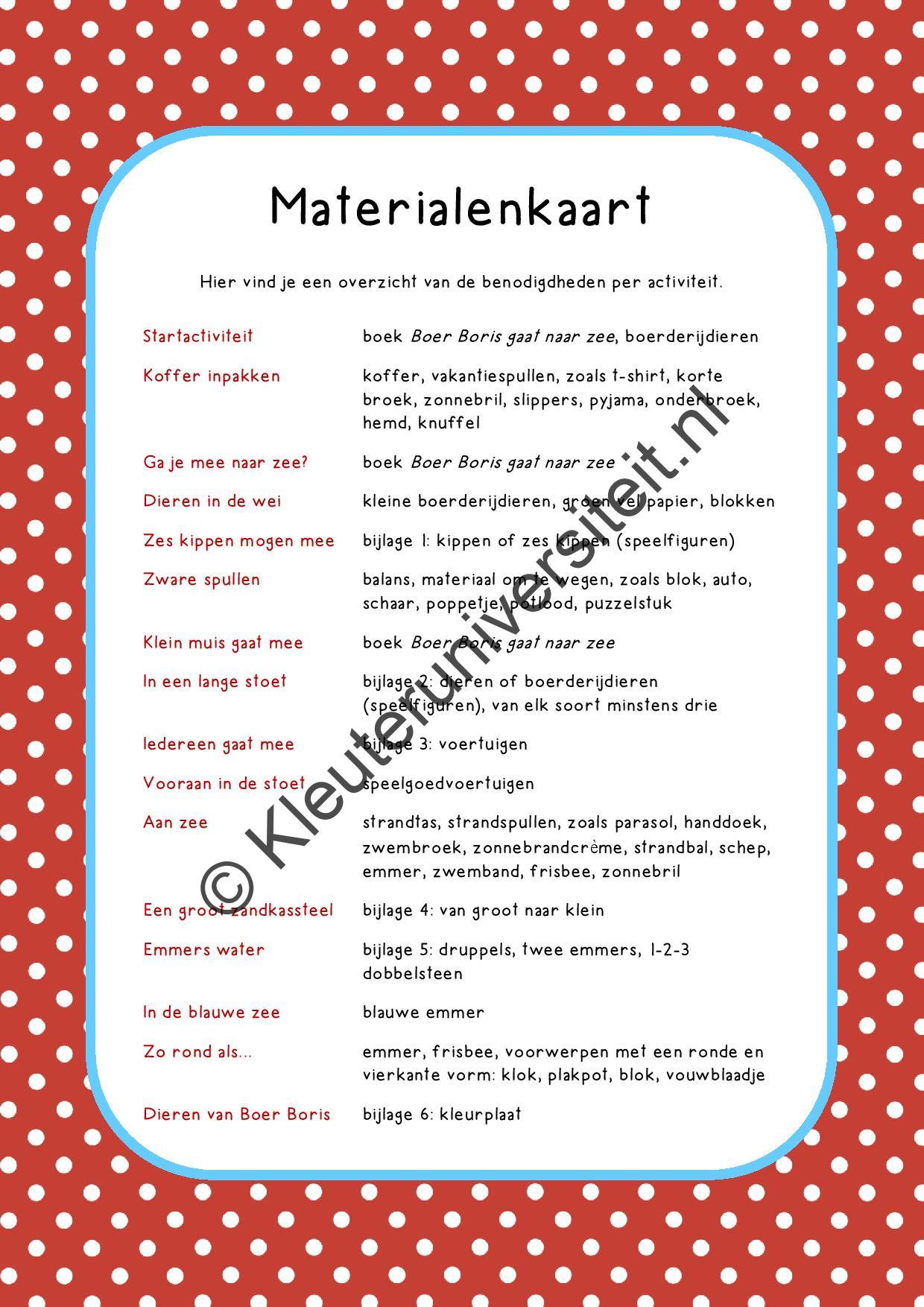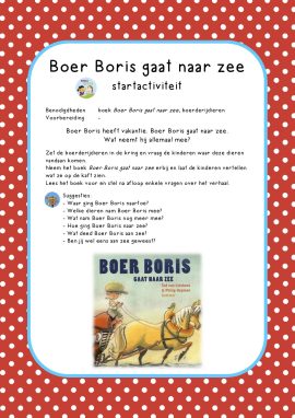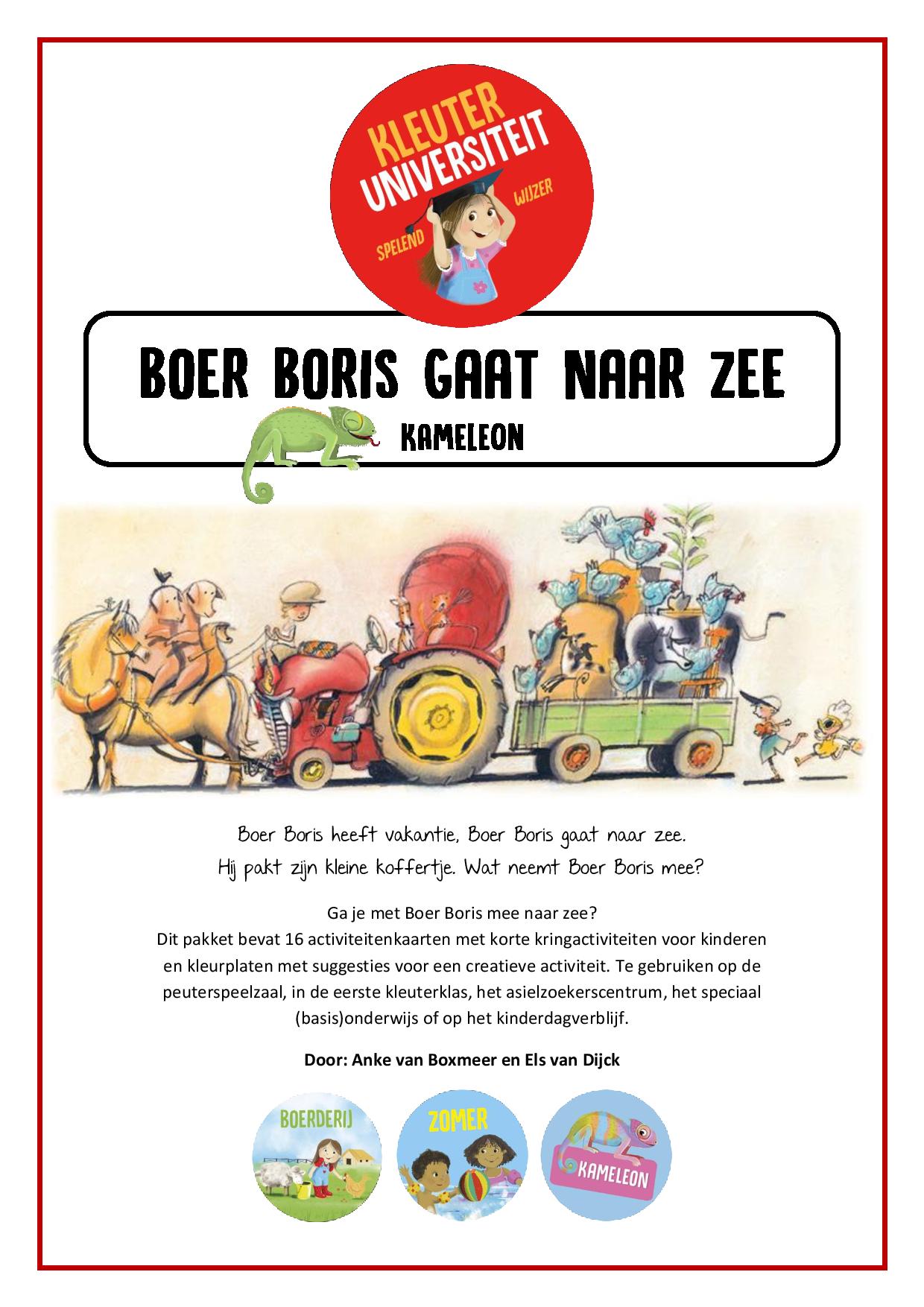 Ga je met Boer Boris mee naar zee? Dit pakket bevat bij het gelijknamige boek Boer Boris gaat naar zee van Ted van Lieshout en Philip Hopman. De activiteiten zijn kort en toegespitst op de doelen die aansluiten bij de ontwikkeling van kinderen.
