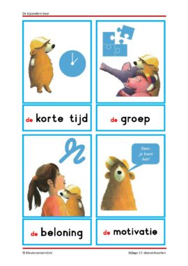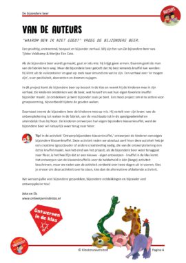 De grote lieve knuffelbare en bijzondere beer uit het bijbehorende prentenboek is vanaf dag één de groepslieveling in mijn groep. Ik heb gebruik gemaakt van dit project tijdens de start van het nieuwe onderwijsjaar. Er is heel veel aandacht voor groepsvorming en centraal staat dat ieder kind mag zijn zoals hij/zij is. Het grootste succes van dit project was het ontwerpen van een groepsknuffel en wat waren de kinderen verrast toen de knuffel echt werd afgeleverd in de groep en precies leek op hun ontwerp. De knuffel heeft nog steeds een prominente plek in onze groep en heeft al heel veel liefdevolle knuffels van de kinderen gekregen.