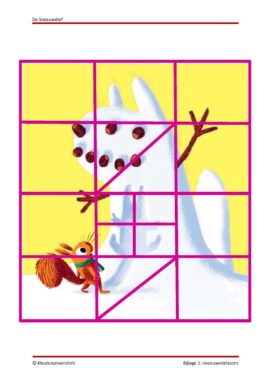 Rode draad: Print één van de sneeuweekhoorns uit bijlage 1. De eerste sneeuweekhoorn in de bijlage heeft evenveel stukken als het aantal activiteiten in dit project en de tweede bestaat uit één geheel en kun je naar eigen inzicht in stukken verdelen. Knip deze in evenveel stukken als het aantal activiteiten dat je inplant. Hang de achtergrond uit bijlage 2 ergens op, zoals op een prikbord of whiteboard. Vertel de kinderen dat zij op zoek gaan naar de Sneeuwdief. Na elke activiteit verdienen ze een stuk van de afbeelding. Dit stuk wordt met een punaise, magneet of dubbelzijdig plakband op een willekeurige plek in het raster bevestigd. Samen vormen de stukken een geheel. Wat er tevoorschijn komt, is nog een verrassing. Dit ontdekken de kinderen gaandeweg het project. De stukken worden uiteindelijk op de juiste plek geplaatst.
