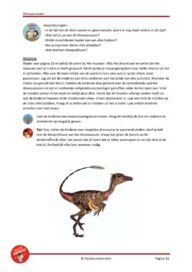 Wat is dit een geweldig project! Het is ontzettend uitgebreid en bevat naast taal- en rekenactiviteiten ook hoeksuggesties en activiteiten die het creatief denken stimuleren. De rode draad was een groot succes in mijn groep. De dino’s zijn voor kleuters al interessante dieren, maar met dit project gaat je thema gegarandeerd leven. Mijn favoriete activiteit was ‘diplodocus’. De kinderen oefenen met auditieve analyse en synthese en maken een lange dino-nek als ze het antwoord weten. Dat laatste bleef gedurende het hele thema een hit: in plaats van een vinger opsteken werd er een lange nek gemaakt.