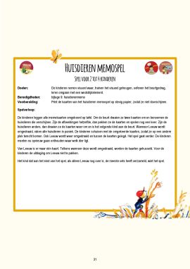 Tijdens de start van het project ben jij met een schepnet in de hand op zoek naar een huisdier. Je vindt het nog niet. Het verhaal wordt voorgelezen en de kinderen ontdekken dat Lia en Leeuw wel een huisdier vinden. Hierna volgen activiteiten op het gebied van taal, rekenen, de creatieve en sociaal-emotionele ontwikkeling, muziek, spel en beweging, natuur, drama en de fijne motoriek die het verhaal in chronologische volgorde doorlopen. Zo creëren de kinderen nieuwe huisdieren door twee dieren met elkaar te combineren, volgen ze een avontuurlijke route door het weiland en spelen ze met onbekende materialen. Het project biedt als bonus ook nog drie avontuurlijke spellen. Het project wordt afgesloten met een zelfverzonnen nieuw avontuur voor Leeuw (of de groepsknuffel).