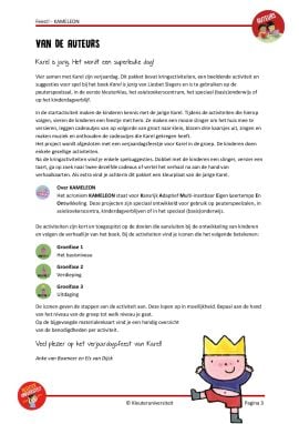 Het acroniem KAMELEON staat voor Kansrijk Adaptief Multi-inzetbaar Eigen Leertempo En Ontwikkeling. Deze projecten zijn speciaal ontwikkeld voor gebruik op peuterspeelzalen, in asielzoekerscentra, kinderdagverblijven of in het speciaal (basis)onderwijs. De activiteiten zijn kort en toegespitst op de doelen die aansluiten bij de ontwikkeling van kinderen en volgen de verhaallijn van het boek. Bij de activiteiten vind je iconen die het volgende betekenen: Groeifase 1 – Het basisniveau, Groeifase 2 – Verdieping, Groeifase 3 – Uitdaging.