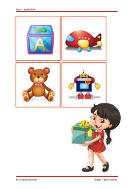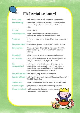 Het project wordt afgesloten met een verjaardagsfeestje voor Karel in de groep. De kinderen doen enkele gezellige activiteiten. Na de kringactiviteiten vind je enkele spelsuggesties. Dobbel met de kinderen een slinger, versier een taart, ga op zoek naar twee dezelfde cadeaus of vertel het verhaal na aan de hand van verhaalkaarten. Als extra vind je achterin dit pakket een kleurplaat van de jarige Karel.