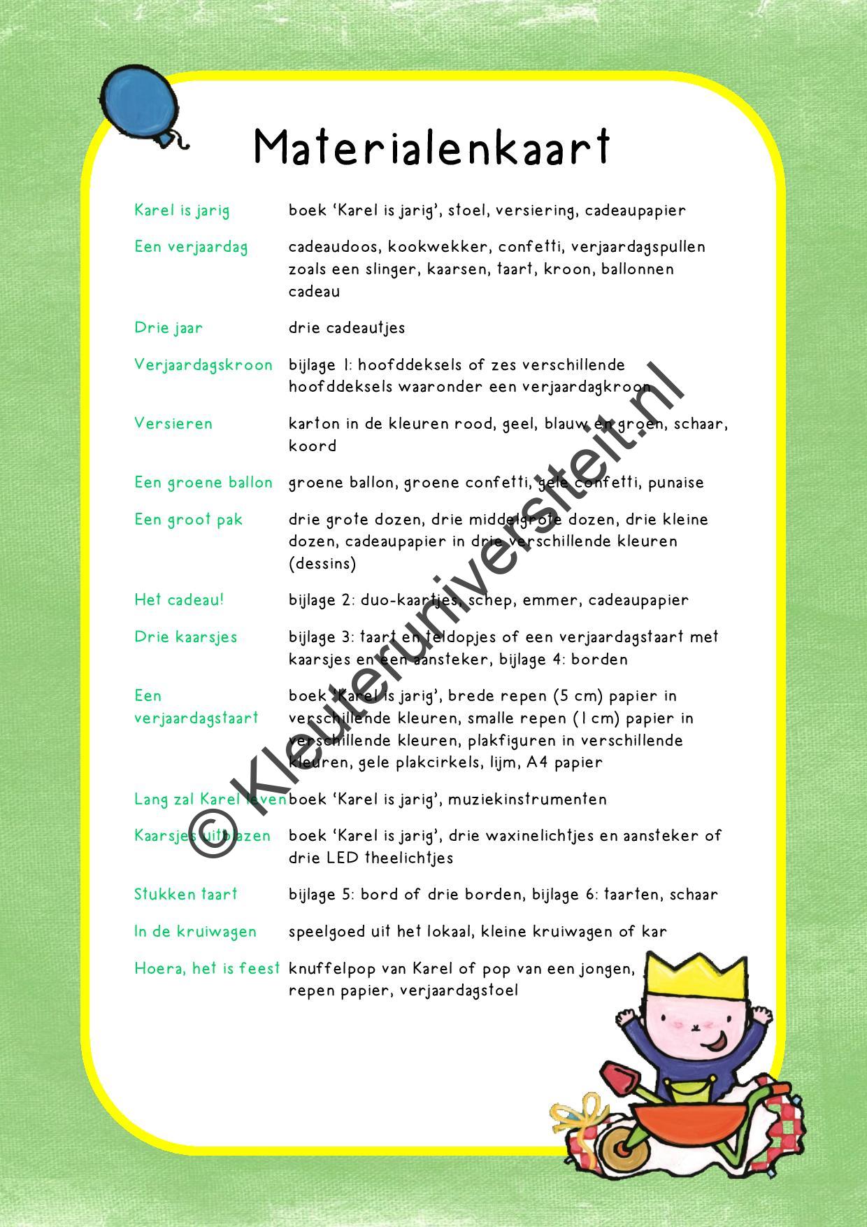 Vier samen met Karel zijn verjaardag. Dit pakket bevat kringactiviteiten, een beeldende activiteit en suggesties voor spel bij het boek Karel is jarig van Liesbet Slegers. In de startactiviteit maken de kinderen kennis met de jarige Karel. Tijdens de activiteiten die hierop volgen, vieren de kinderen een feestje met hem. Ze maken een mooie slinger om het huis mee te versieren, leggen cadeautjes van op volgorde van groot naar klein, blazen drie kaarsjes uit, zingen en maken muziek en onthouden de cadeautjes die Karel gekregen heeft.
