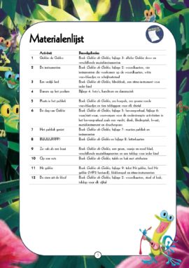Het project bevat naast taal- en rekenactiviteiten meerdere muziek- en dansactiviteiten en er worden suggesties voor de diverse hoeken gegeven. Zie voor een overzicht van de activiteiten het lesrooster op pagina 7. Dit rooster kun je desgewenst naar eigen inzicht aanpassen. Op pagina 5 en 6 vind je een materialenlijst, waarop is aangegeven welke materialen voor elke activiteit nodig zijn. Als je voor een activiteit een bijlage nodig hebt, wordt dit bij de activiteit onder het kopje ‘materiaal’ vermeld. Druk de bijlage af, knip de afbeeldingen uit en lamineer deze eventueel.