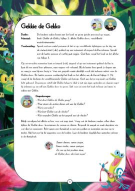 Gekkie de Gekko is wereldberoemd en erg druk met zijn eigen optredens. Hij roept daarom de kinderen op om zelf een Gekkie show te geven. Samen werk je toe naar een show waarbij de kinderen optreden. Dit project bij het boek ‘Gekkie de Gekko’ van Rachel Bright en Jim Field, bevat taal-, reken-, muziek- en dansactiviteiten waarmee je drie weken aan de slag kunt. Het project bevat tevens een origineel liedje van Jeroen Schipper in MP3 formaat.