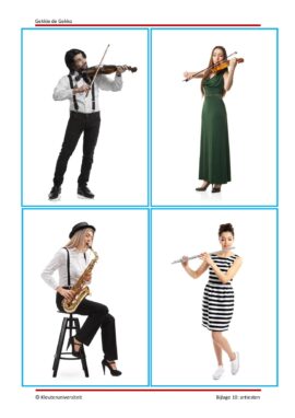 Rode draad: Print, lamineer en hang de kleine sterren van bijlage 1, het sterrenpad, aan de muur. Bepaal vooraf hoeveel activiteiten je uitvoert en hang evenveel kleine sterren op. Op de eerste ster komt de afbeelding van Gekkie van bijlage 1 te staan. Print, lamineer en knip de instrumenten uit bijlage 2. Na elke activiteit verplaats je de afbeelding van Gekkie naar een volgende ster en plak je een instrument van bijlage 2 op de oude ster. Je kunt dit moment eventueel gebruiken om het (echte) instrument bij de kinderen te introduceren. Luister hoe het instrument klinkt en doe voor hoe je het bespeelt. Het sterrenpad eindigt bij de grote ster van bijlage 1. Als alle sterren vol zijn, vindt de Gekkie show plaats.