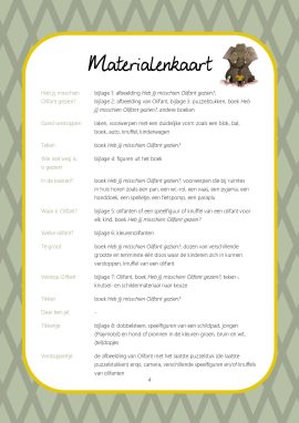 Met dit grappige prentenboek en de activiteiten uit dit pakket beleven de kinderen en jij zeker veel plezier. Het pakket bevat vijftien activiteiten. Kringactiviteiten voor rekenen en taal, een creatieve opdracht en twee spellen om samen te spelen. Tijdens de startactiviteit gaan de kinderen op zoek naar een boek. Ze vinden ‘Heb jij misschien Olifant gezien?’. Het verhaal wordt voorgelezen. Hierna volgen activiteiten die het boek in chronologische volgorde doorlopen en waarbij ‘verstoppen’ en ‘zoeken’ centraal staan. De activiteiten zijn kort en toegespitst op de doelen die aansluiten bij de ontwikkeling van kinderen.