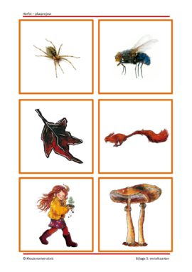 Tijdens elke activiteit staat iets van de herfst centraal, zoals een kastanje, herfstblad, eikel, of kale tak. Wat centraal staat, zegt de titel van de activiteit. Zorg ervoor dat dit in ieder geval op de thematafel ligt. Wellicht heeft een kind het meegebracht en zo niet, ga dan zelf op zoek. Gebruik voor de spin, vogel, eekhoorn en paddenstoel een knuffel, speelfiguur of afbeelding. Van de andere dingen kun je een echt exemplaar neerleggen.