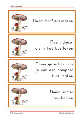 In dit project gaan de kinderen op zoek naar de herfst. Ze ontdekken tijdens activiteiten voor taal, rekenen en natuur en techniek hoe mooi de natuur is, ook in de herfst! Ze leren over paddenstoelen, eekhoorns, kastanjes, eikels, loof- en naaldbomen, herfstkleding en nog veel meer. Het project is geschreven bij het sfeervolle prentenboek Op zoek naar de herfst van Sanne Ramakers, Merel de Vink en Marjolein Hund. Als je door dit boek bladert, wil je de herfst niet meer mee naar binnen nemen, dan wil je meteen naar buiten! Of het nu regent of niet …