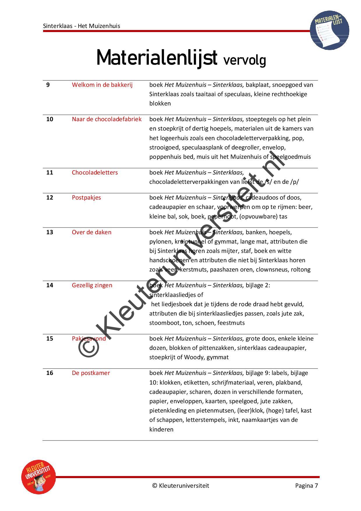 Daarnaast vind je bij de extra activiteiten onder andere een tip voor het inrichten van een spelhoek, het samen knutselen van een logeerhuis en activiteiten voor mindfulness waarbij de kinderen rustmomenten ervaren in de drukke sinterklaasperiode. Het project wordt net voor pakjesavond afgesloten met spellen waarbij materialen die pakjes voorstellen centraal staan.