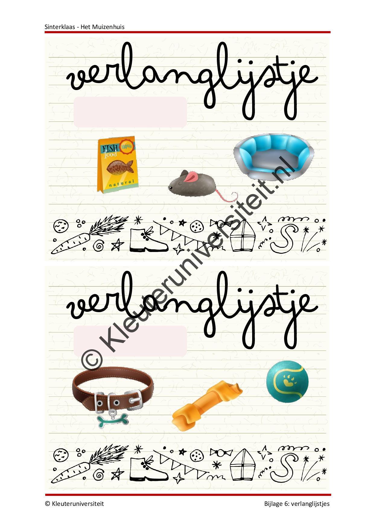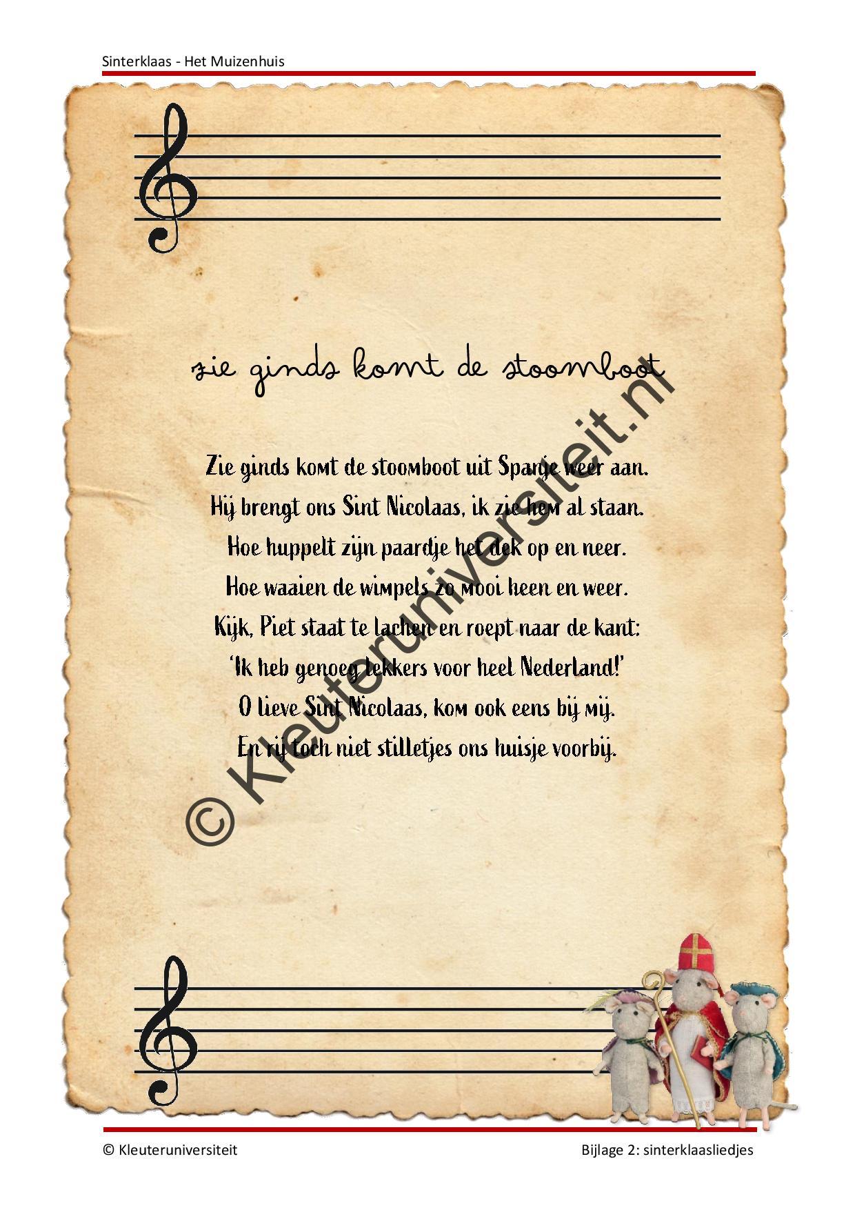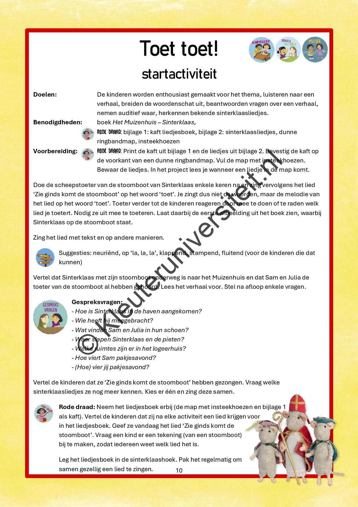 Rode draad: Tijdens dit project maken de kinderen een liedjesboek met sinterklaasliedjes. Hiervoor gebruik je de kaft uit bijlage 1 en de sinterklaasliedjes uit bijlage 2. Na elke activiteit krijgen de kinderen een liedje dat je eerst samen zingt voordat het in het liedjesboek komt. Kies zo mogelijk een lied dat aansluit bij de activiteit of de bijbehorende illustratie in het boek Het Muizenhuis – Sinterklaas, bijvoorbeeld bij de activiteit Lossen maar! past het lied De zak van Sinterklaas en bij Verlanglijstjes past O, kom er eens kijken.
