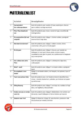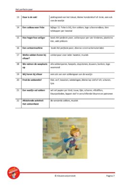 Help prins Theo zijn lievelingssok terug te vinden en ontdek dat niet alles perfect hoeft te zijn. Dit project, gebaseerd op het prentenboek ‘Het perfecte paar’ van Katrien Benaets, bevat reken-, taal-, beweeg-, techniek-, beeldende-, drama- en sociale – emotionele activiteiten en suggesties voor de hoeken. Met dit project kun je zo’n vier weken aan de slag.