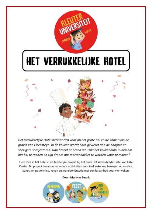 Help mee in het hotel in dit feestelijke project bij het boek ‘Het Verrukkelijke Hotel’ van Kate Davies. Dit project bevat onder andere activiteiten voor taal, rekenen, bewegen op muziek, kunstzinnige vorming, koken en wereldoriëntatie met een lesaanbod voor zo’n 4 weken.