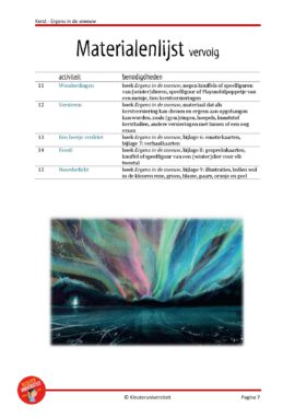 Het project wordt afgesloten met een sfeervolle activiteit waarbij de kinderen zelf V het verhaal Ergens in de sneeuw vertellen. Voorin het project vind je een lesrooster. Op de materialenkaart zie je welk materiaal je voor elke activiteit nodig hebt. Wanneer je een bijlage nodig hebt, wordt dat bij de activiteit onder het kopje ‘benodigdheden’ vermeld. Druk de bijlage af, knip de afbeeldingen uit en lamineer deze indien nodig.