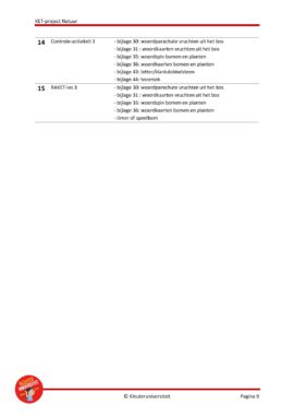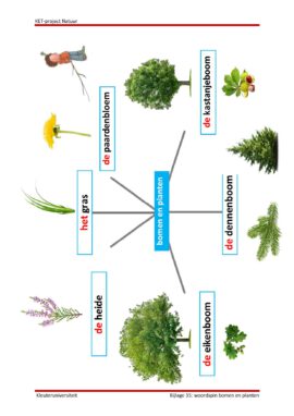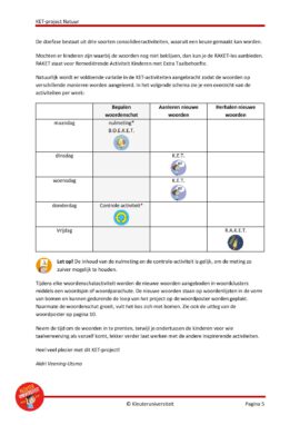 Wat tof dat dit KET project zo goed past bij het reguliere project! In het project zit een inhoudsopgave, waarin je precies kunt zien wanneer je welke activiteit uit welk project kunt doen. Dat is natuurlijk naar eigen inzicht in te delen, maar het is toch handig dat deze erin zit. Dit project is, net als het reguliere project, geschreven voor 3 weken (maar langer kan altijd 🙂 ) waarin elke week hetzelfde is opgebouwd. Je begint met een BOEKET les, een boek oriënterende opdracht en daarna volgen 2 dagen een KET les waarbij woordclusters worden aangeboden (denk aan: herfstvruchten, kriebelbeestjes, bomen en planten, enz) met allerlei suggesties daarbij om deze aan te bieden. Vervolgens doe je op de 4e dag een controle activiteit waarbij je er achter kunt komen in hoeverre de woorden zijn blijven hangen of niet en dan kun je op dag 5 nog een RAKET activiteit doen, een remediërende activiteit. Het leuke aan dit project is ook dat je begint met een ‘leeg’ bos en elke keer als je een woordcluster hebt aangeboden, plak je een boom in het bos met daarop de woorden die behandeld zijn. Als je alle clusters hebt gehad, is het bos gevuld! Supermooie aanvulling voor de wat taalzwakkeren, maar ook zeker geschikt voor de hele groep!