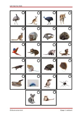 Geef ieder kind een zoekkaart en laat hen op de kaart zoeken welk dier er op de foto van Frenk staat. Kruis de afbeelding vervolgens op de zoekkaart door. Zoek de woordkaart van bijlage 5 die past bij het gekozen dier en plak deze in het logboek van bijlage 4. Het project eindigt als het logboek geheel is gevuld met dierenfoto’s.