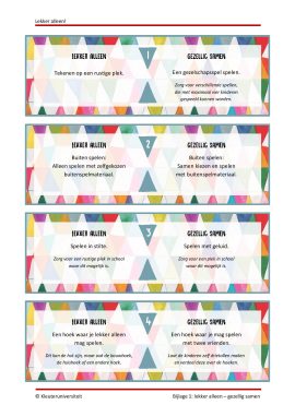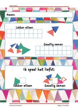 Deze keuze staat op een van de genummerde kaarten uit bijlage 1. Ieder kind kiest zelf een van beide mogelijkheden. De keuze sluit altijd aan bij de gegeven activiteit. Op de keuzelijst uit bijlage 2 houden de kinderen zelf bij hoe vaak ze kiezen voor lekker alleen en gezellig samen door na elke activiteit een vak in de juiste tabel te kleuren.