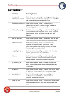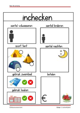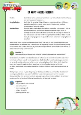 Richt de receptie in, beman de campingwinkel, vul de ijskraam, bouw een zwembad, houd de douchetijd bij, zoek de weg op de camping, maak een folder over bezienswaardigheden in jouw buurt, raad wie er snurkt in de slaapzak en maak een kampvuur. Bepaal zelf welke activiteiten je wil uitvoeren, ook de volgorde is vrij. Met dit project kun je minimaal drie weken aan de slag.