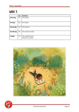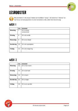 Voorin het pakket vind je een handig lesrooster. Dit rooster kun je volgen of naar eigen inzicht aanpassen. Met het project kun je gedurende drie weken elke dag aan de slag. Op de materialenkaart zie je welk materiaal je voor elke activiteit nodig hebt. Wanneer je een bijlage nodig hebt, wordt dat bij de activiteit vermeld. Druk de bijlage af, knip de afbeeldingen uit en lamineer deze zo nodig. Neem de kinderen mee naar buiten. Voel de wind, ruik aan een bloem, kijk om je heen of loop met je blote voeten in het gras.