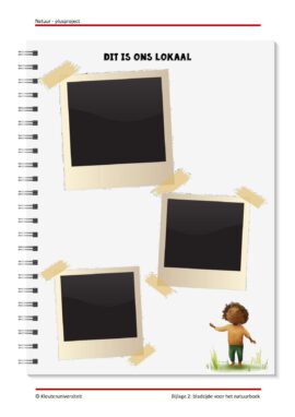Na elke activiteit leggen de kinderen vast wat ze hebben geleerd in hun eigen natuurboek. Print hiervoor de pagina’s uit bijlage 2 voor elk kind en zorg voor een map of snelhechter. Geef de kinderen na de activiteit de gelegenheid om in het natuurboek te werken of geef dit als opdracht gedurende de week tijdens de speel-/werktijd.