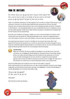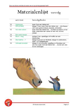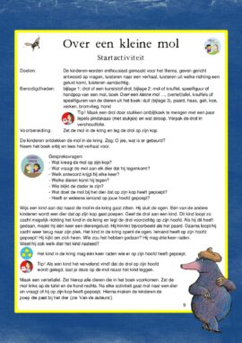 In dit project ga je met de mol langs alle dieren uit het boek ‘Over een kleine mol die wil weten wie er op zijn kop gepoept heeft’. Bij elk dier voer je twee activiteiten uit op het gebied van rekenen, taal, kunstzinnige vorming, muziek en spel en beweging. Met dit project, gebruikmakend van het boek ‘Over een kleine mol die wil weten wie er op zijn kop gepoept heeft” van Werner Holzwarth en Wolf Erlbruch, kun je drie weken aan de slag.