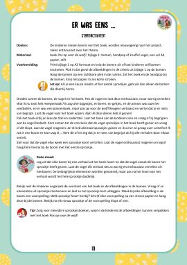 Rode draad: In elk verhaal zitten illustraties van vogels, die het sprookje vanaf de zijlijn volgen. Een handpop of knuffel van een vogel gaat bij de startactiviteit en bij elk nieuw verhaal in gesprek met de kinderen. De vogel vertelt herkenbare stukjes uit het verhaal, zodat aan de illustraties te herleiden is welk sprookje wordt bedoeld.