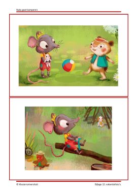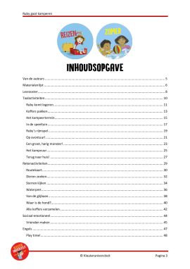 Rode draad: Ruby’s vader heeft een boek voor haar gemaakt waarin ze kan lezen wat ze kan beleven als ze op kampeervakantie gaat. Dit is het prentenboek Ruby gaat kamperen. Print en lamineer bijlage 1: kampeerspullen voor Ruby. Knip de kaarten los. In de startactiviteit vinden de kinderen deze kaarten. Hang ze op in het lokaal. Stop na elke activiteit de kaart in Ruby’s koffer die hoort bij die activiteit. Als alle kaarten zijn ingepakt in haar koffer is het tijd voor de afsluiting van het project: de tentendag. Daarna is Ruby klaar om met haar familie op vakantie te gaan.